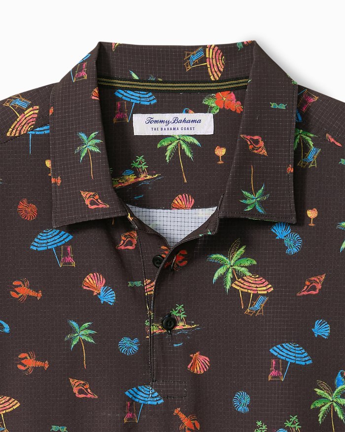 The contrast of a sleek black foreground and colorful beach-inspired motifs inspires a bold and breathable polo style, complete with microperforations that boost airflow and plenty of stretch.