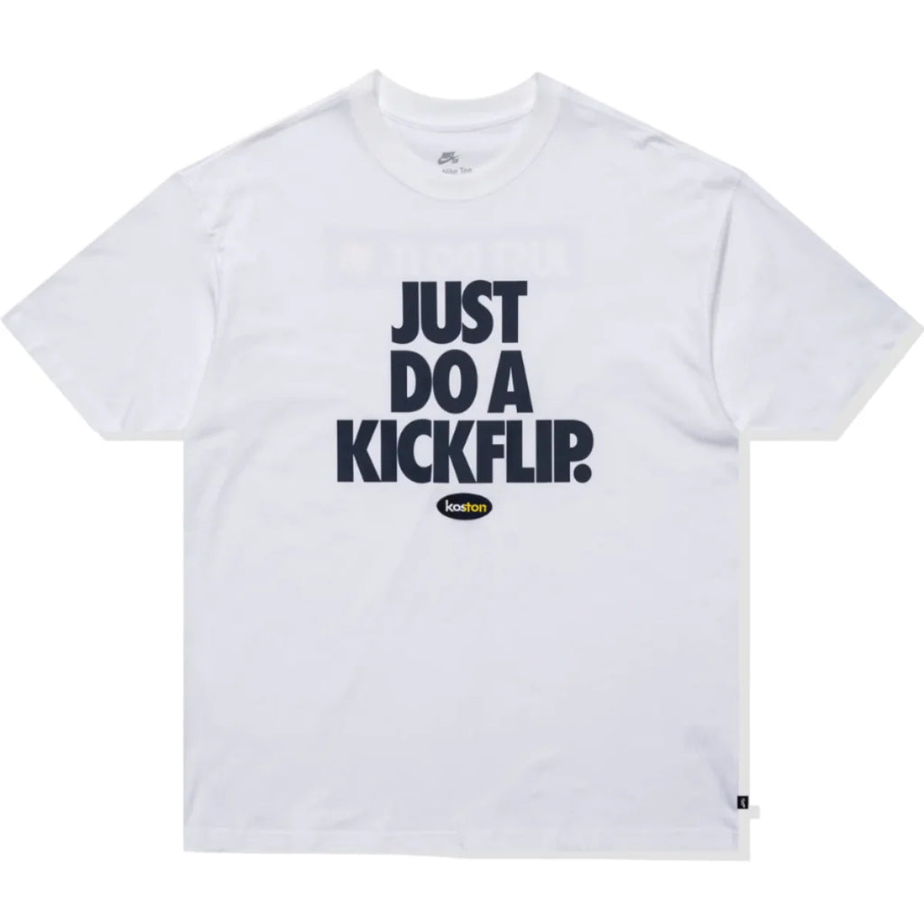 The Koston Tee brings out Koston’s dry humor to a classic Max90 cut, captured front and back. On the chest, the oversize “JUST DO A KICKFLIP.” print sits slightly angled with a tiny “koston” hit in yellow tucked below, while the back carries a bold “JUST DO IT.” bar with a yellow Nike SB tag at the righ