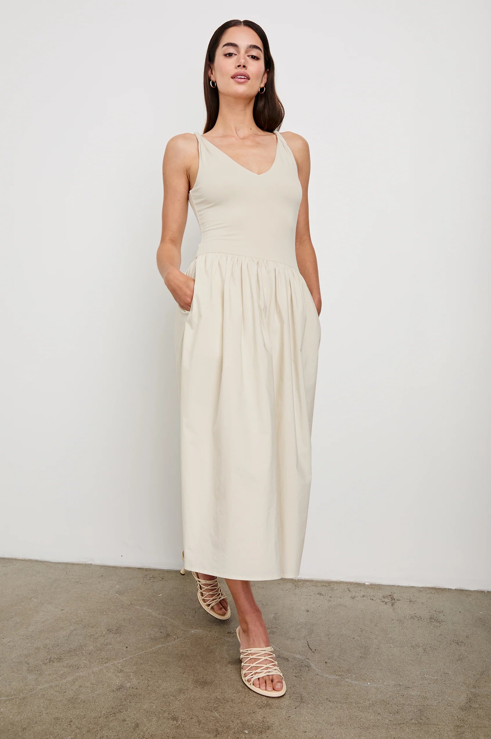 The Franca Dress emphasizes effortless elegance, combining an ultra-soft jersey cotton bodice with a lightweight poplin skirt for all-day comfort. Featuring twisted jersey straps, a flattering dropped waist and on-seam pockets for convenience, this midi, bodycon dress is a must for the modern woman on the go.