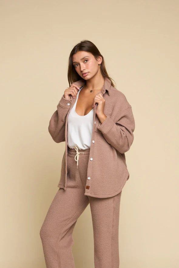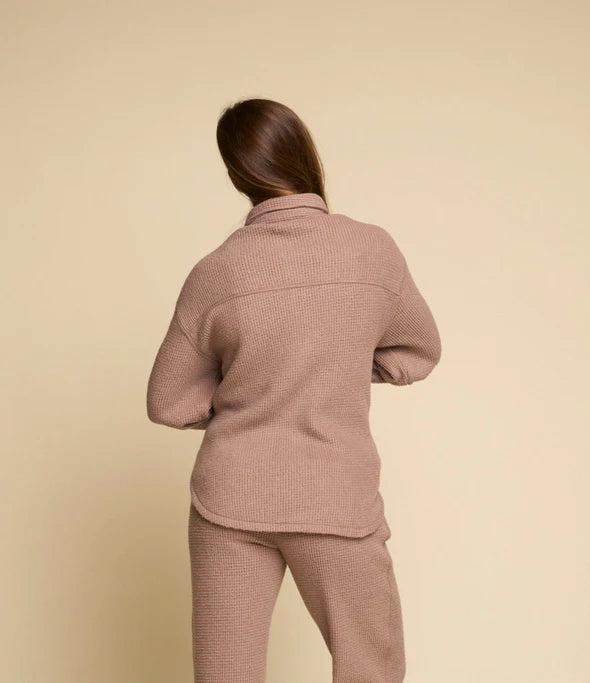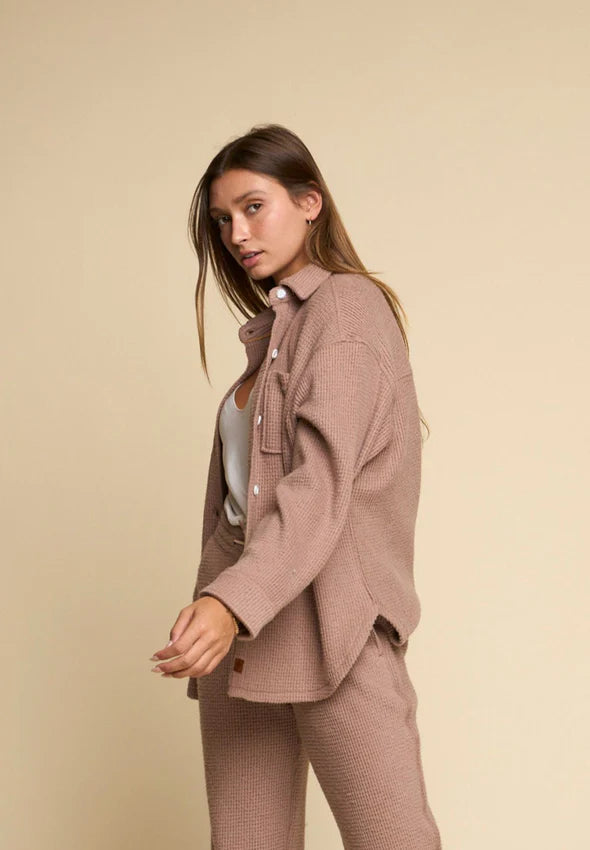 The Longshoreman - Women’s Shirt Jacket in mocha blends structure and softness in a fall-ready waffle fabric. Designed with a shirt tail hem, chest pocket, and adjustable cuff sleeves, it’s a cozy layer with refined utility.