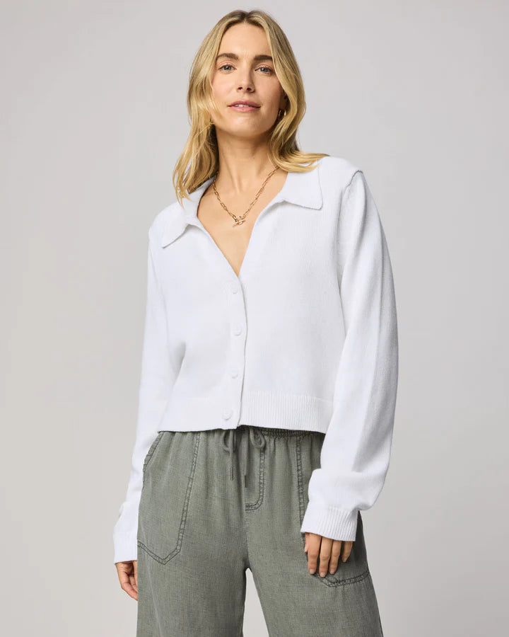 Your new favorite layer for easy days. This soft, slightly cropped cardigan keeps things relaxed, with an open collar and button-up front that adds a hint of polish. Layer up or wear it on its own, you always look effortlessly put-together.