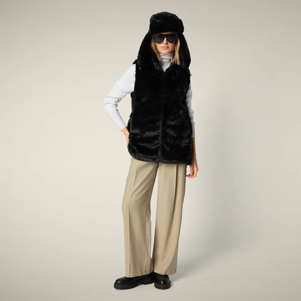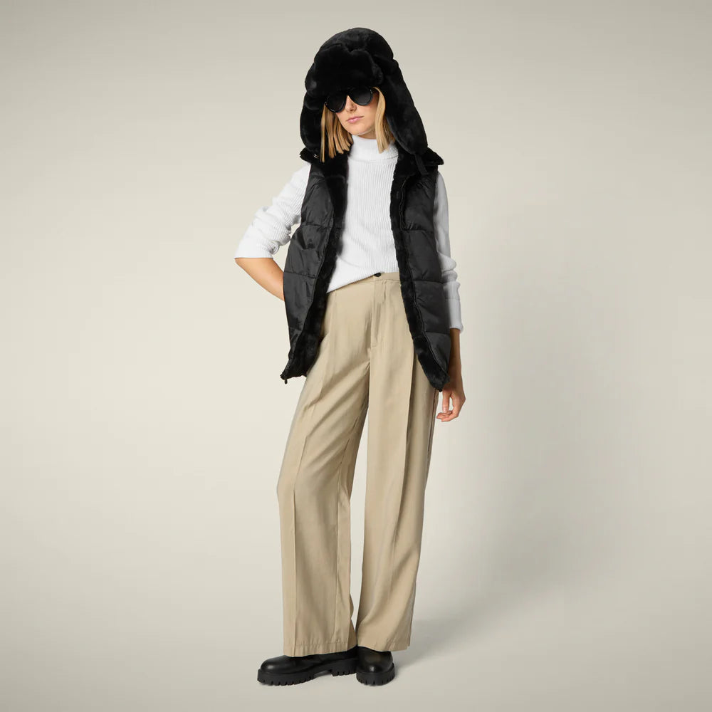 Switch up your look in an instant with the Nives model women’s puffer vest, designed to double your options and elevate any outfit. This reversible piece features a quilted side and a plush faux fur side, all in one versatile design. Finished with a stand-up collar, two pockets, a central zipper with a reversible slider, custom pull, and a matching round logo that completes the look.